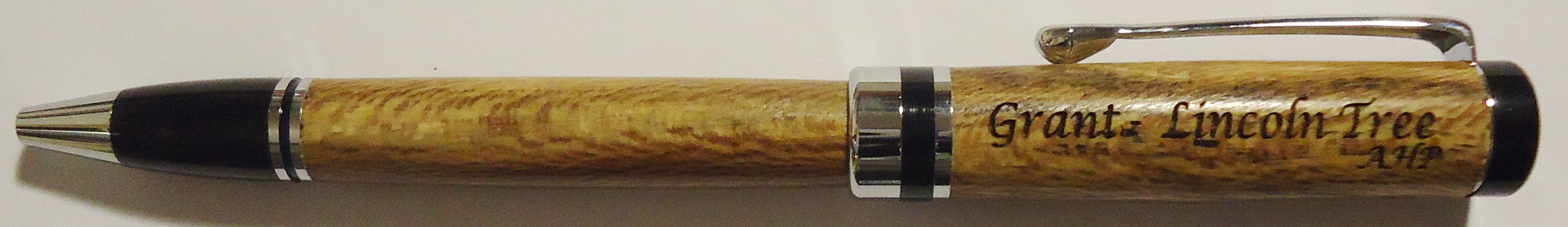 The Grant- Lincoln Sycamore This collectible pen was handcrafted from a sycamore tree that stood by General Grant's Civil War headquarters at City Point, Va. The historic witness tree was removed from the National Battlefield site during the summer of 2007 by the National Park Service. City Point served as the command and supply center during the ten month siege of Petersburg, Va. Petersburg, with its railway network, was the key to the capture of the Confederate capitol of Richmond, Va. After several unsuccessful direct assaults on Petersburg, General Grant started the longest siege in American warfare. The simple log cabin that served as Grant's headquarters was built in December of 1864. Grant's cabin had only two rooms, a front office and a small apartment for his wife and son. The grounds were on Appomattox Manor owned by Dr. Richard Eppes. Dr. Eppes owned about 130 slaves on his 2,300 acre estate. Many of the slaves gained their freedom in 1862 when Union troops temporarily landed at City Point. On March 24, 1865 President Lincoln, along with his wife Mary and son Tad, arrived at City Point aboard the riverboat River Queen. Lincoln wanted to be near the battlefield so near the end of the bloody Civil War and away from the pressures of Washington. While at City Point Lincoln met with both Generals Grant and Sherman, along with visiting the battlefield and troops. Aboard the River Queen Lincoln outlined his vision for the end of the war. American Heritage Pens 207-659-5104 wpens@aol.com |