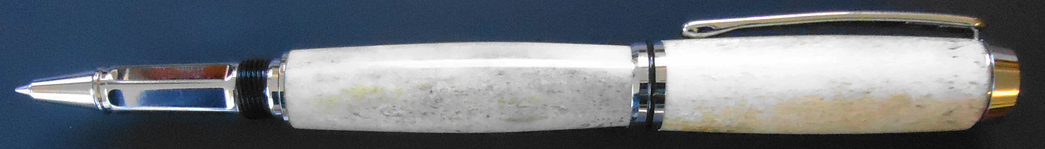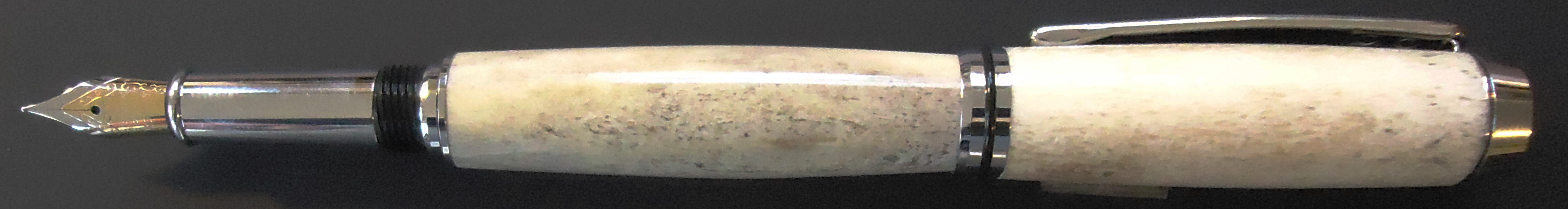 This collectible, refillable pen was crafted from a naturally shed moose antler. The antlers are drops, ones that have been naturally shed in the wild. Bull moose shed their antlers each year and they are sometimes found in the woods by collectors, hikers or sportsmen. The antlers vary in texture, color and density depending on the condition of the moose. We can only take what nature gives. image by Roger Stevens Jr. mainefocusphotography.biz |