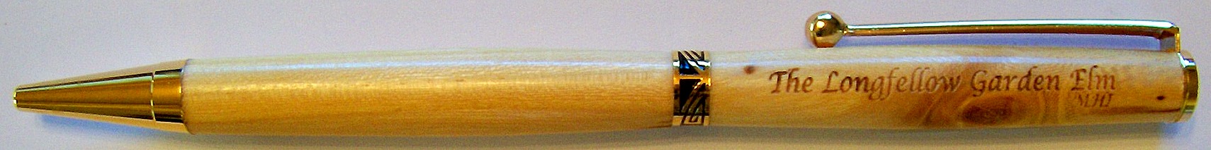 This lovely pen was handcrafted from an elm tree recently removed from the Wadsworth-Longfellow Garden in downtown Portland, Maine. In front of the historic Garden, the Wadsworth-Longfellow House is under restoration through 2002. Now a National Historic Landmark, the Georgian style house survives as one of Portland's earliest historic buildings. It has been a museum since 1901, when Anne Longfellow Pierce (1810-1901) gave the house and gardens to the Maine Historical Society as a tribute to her famous brother, Henry Wadsworth Longfellow, and their renowned family Built by General Peleg Wadsworth, A Revolutionary War hero, the homestead was occupied by his ten children, including Henry W. Longfellow's mother. During her frequent visits to the home, Henry became an aspiring poet and eventually one of the most famous literary figures of his day. It is said that Henry and his siblings even inscribed poetry verses on walls and behind the shutters of the homestead. The spirits of three vibrant generations of the Wadsworth-Longfellow family may be felt in the garden as one recites "The Children's Hour" or some other favorite Longfellow poem. Perhaps this pen will inspire you one day to write a poem or visit the famous Wadsworth-Longfellow House/Museum of Portland, Maine. |