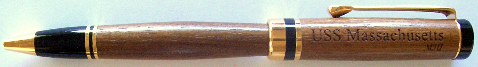 This pen was handcrafted from teak removed during the 1999-2000 deck restoration on board battleship USS Massachusetts, also referred to as Big Mamie. The ship was built in Quincy, Massachusetts and delivered to the Boston Navy Yard in April 1942. Battleship Massachusetts went into action on November 8, 1942 in Operation Torch, the invasion of North Africa, where she silenced an enemy battleship and sank two destroyers, two merchant ships, and a floating drydock. The ship also saw extensive action in the Pacific Theatre. She patrolled the New Guinea-Solomons area and participated in the invasion of the Gilbert Islands. She took part in the invasion of the Marshall Islands in January 1944, carrier strikes against Turk, and a series of raids against Japanese bases in the Western Pacific and Asia. In 1945, Big Mamie protected the carriers off Iwo Jima, and her 16-inch guns pounded Okinawa before the island was invaded. Next, Battleship Massachusetts was off to Japan with the Third Fleet, bombarding a steel works in Kamaishi and a factory in Hamamatsu. After the war, she served with the Pacific Fleet until 1946 when she was deactivated. Stricken from the Navy Register in 1962, Big Mamie was ordered sold for scrap. Fortunately, her wartime crew had held annual reunions and decided to save their ship as a memorial. In 1965, Big Mamie was brought to Fall River, Massachusetts and was opened to the public. The ship has been designated a National Historic Landmark "for its significance in commemorating the history of the United States of America". For more information on the USS Massachusetts or other ships at Battleship Cove, contact Battleship Cove, 1-800-533-3194, email address: battleship@battleshipcove.com. American Heritage Pens Maine Heritage Inc. MHI Old Town, Me. 207-659-5104 wpens@aol.com |